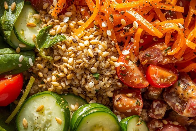 En un bowl grande, coloca la quinoa como base. Añade las verduras en secciones o mezcladas según prefieras. Incorpora la proteína elegida y espolvorea las semillas por encima. Vierte el aderezo sobre todo y mezcla suavemente para que todos los ingredientes queden cubiertos sin aplastar las verduras.
